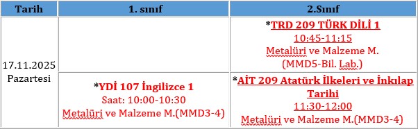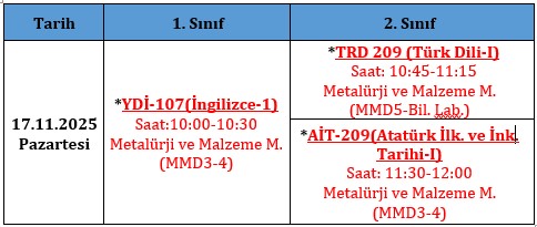 Biyomühendislik, Çevre, İnşaat, Jeoloji, Kimya, Metalürji ve Malzeme Mühendisliği öğrencileri Metalürji ve Malzeme Mühendisliği Bölümü'nde sınava girecektir (6 Bölüm). Diğer Bölüm öğrencileri kendi bölümlerinde sınava girecektir.